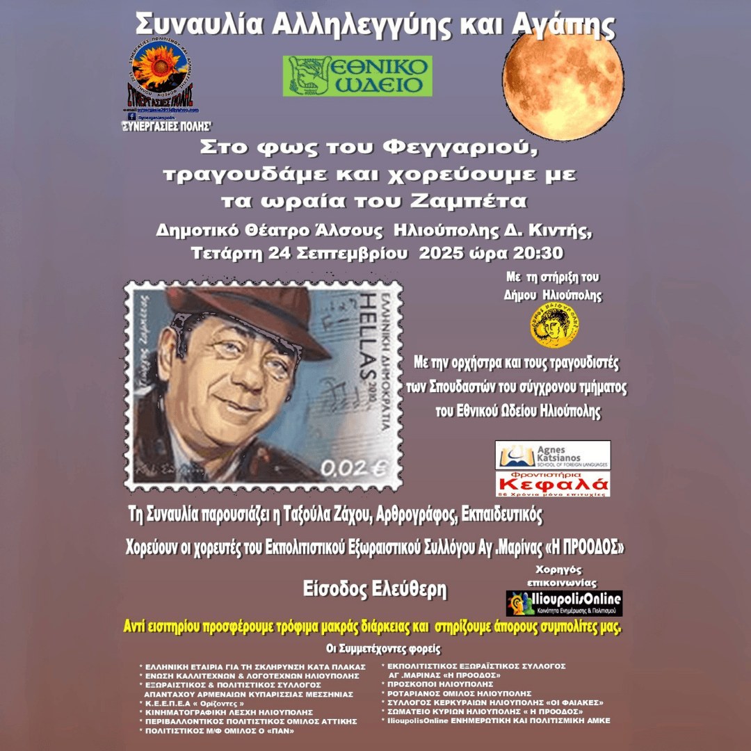 Οι «Συνεργασίες Πόλης» και το Εθνικό Ωδείο Ηλιούπολης διοργανώνουν σήμερα μία συναυλία αλληλεγγύης και αγάπης, με όνομα «Στο φως του Φεγγαριού, τραγουδάμε και χορεύουμε με τα ωραία του Ζαμπέτα».