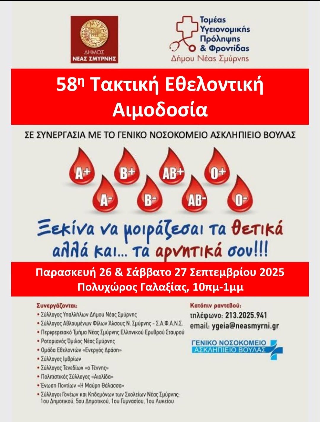 Η αιμοδοσία πραγματοποιείται σε συνεργασία το Γενικό Νοσοκομείο Ασκληπιείο Βούλας και θα γίνει την Παρασκευή 26 και το Σάββατο 27 Σεπτέμβριου, ώρες 10:00-13:00 στον Δημοτικό Πολυχώρο «Γαλαξίας» κατόπιν ραντεβού.