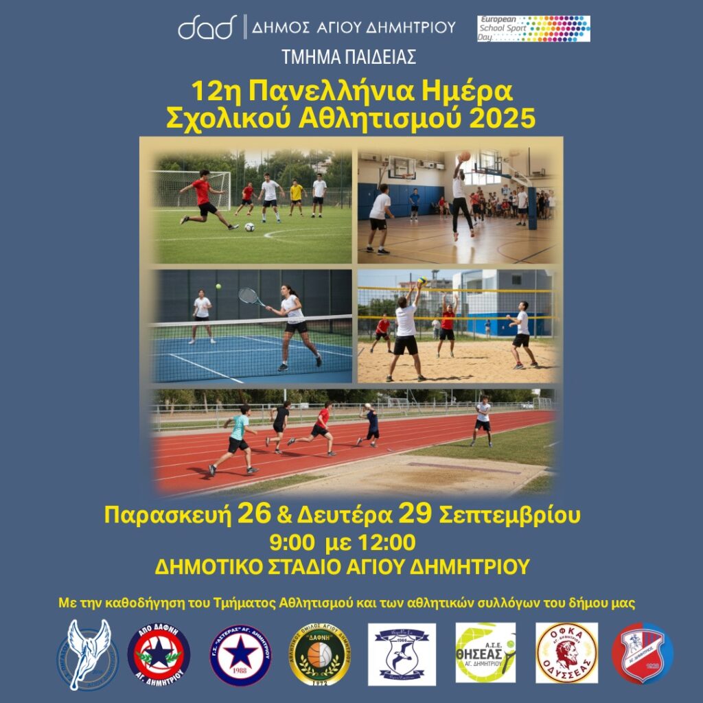 Στο πλαίσιο της Σχολικής Ημέρας Αθλητισμού, το Τμήμα Παιδείας διοργανώνουν διήμερες αθλητικές εκδηλώσεις στο Δημοτικό Στάδιο Αγίου Δημητρίου, με το συντονισμό της αντιδημάρχου Αγγελικής Σαραβελάκη και τη συνεργασία του εντεταλμένου δημοτικού συμβούλου Αθλητισμού, Παντελή Ζωίλη.