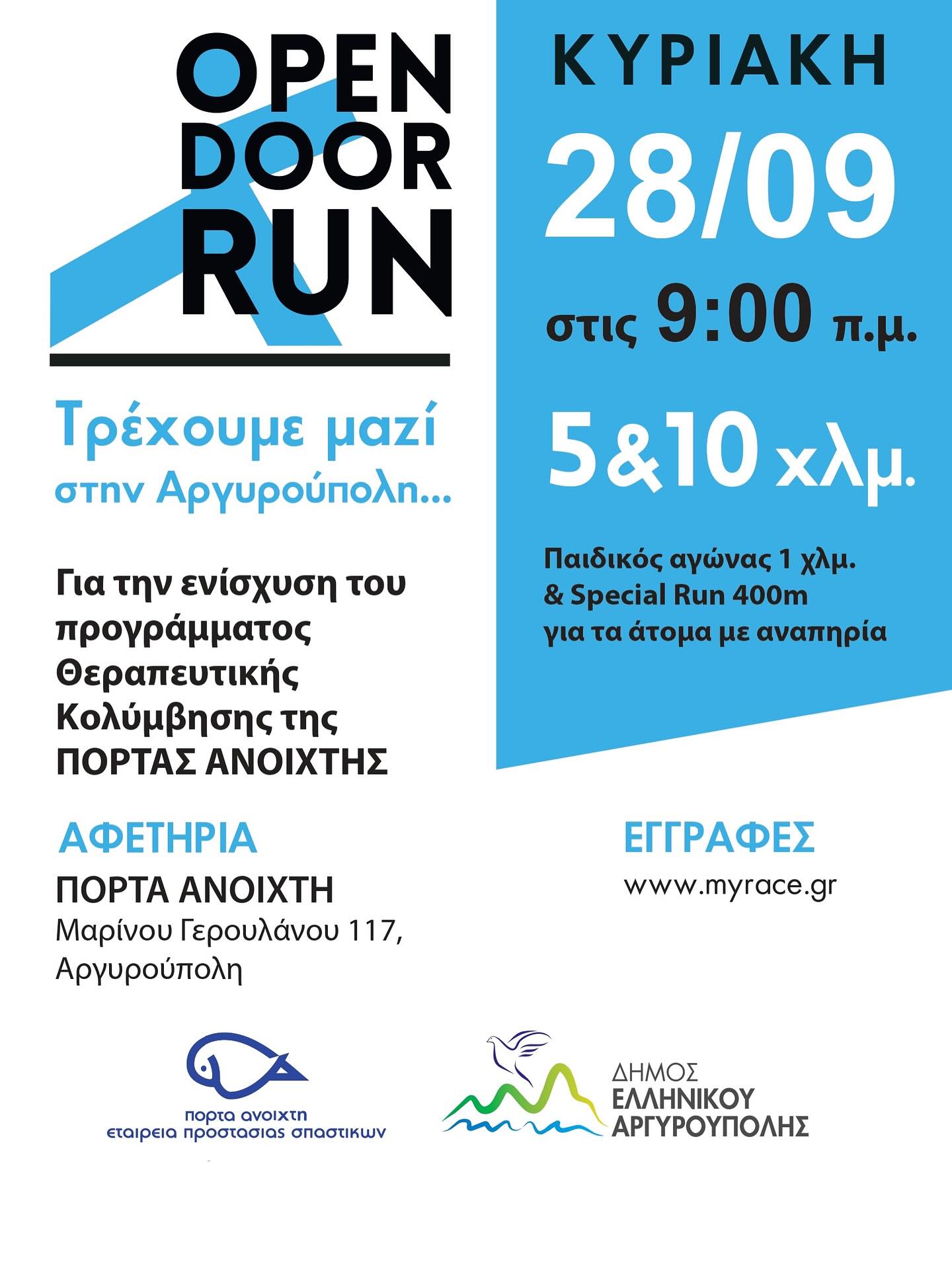 Ο Αγώνας Open Door Run περιλαμβάνει αγώνες δρόμου των 10 και 5 χλμ. για τους ενήλικες, special run 400μ. για τα άτομα με αναπηρία και των 800μ. για τα παιδιά. Οι εγγραφές έχουν κλείσει.