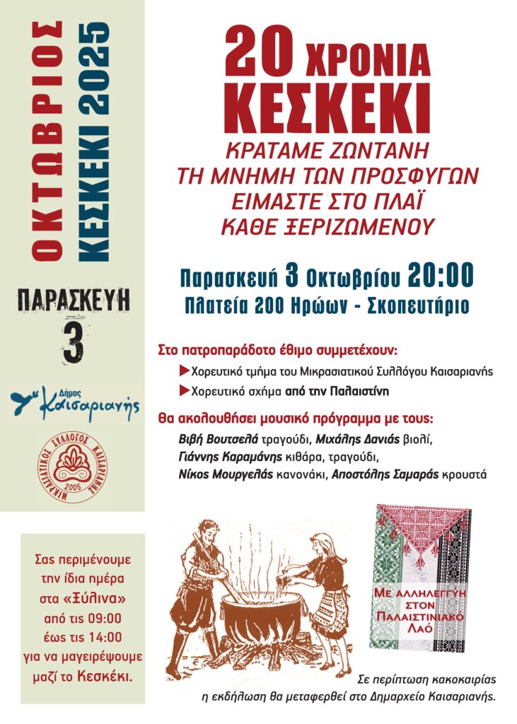 Ο Δήμος Καισαριανής, σε συνεργασία με τον Μικρασιατικό Σύλλογο Καισαριανής, αναβιώνουν στην πόλη και φέτος για 20η χρονιά, το παραδοσιακό έθιμο «Κεσκέκι» με μουσική και χορό από την Μικρά Ασία, μια εκδήλωση τιμής και μνήμης στο Μικρασιατικό Ελληνισμό.