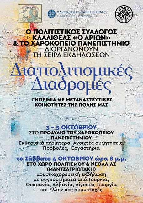 Ο Πολιτιστικός Σύλλογος Καλλιθέας «Ο Αρίων» και το Χαροκόπειο Πανεπιστήμιο διοργανώνουν μία σειρά εκδηλώσεων, με τίτλο «Διαπολιτισμικές Διαδρομές», με θέμα τις μεταναστευτικές ροές, προβληματισμούς και προοπτικές, στο παρόν και στο μέλλον.