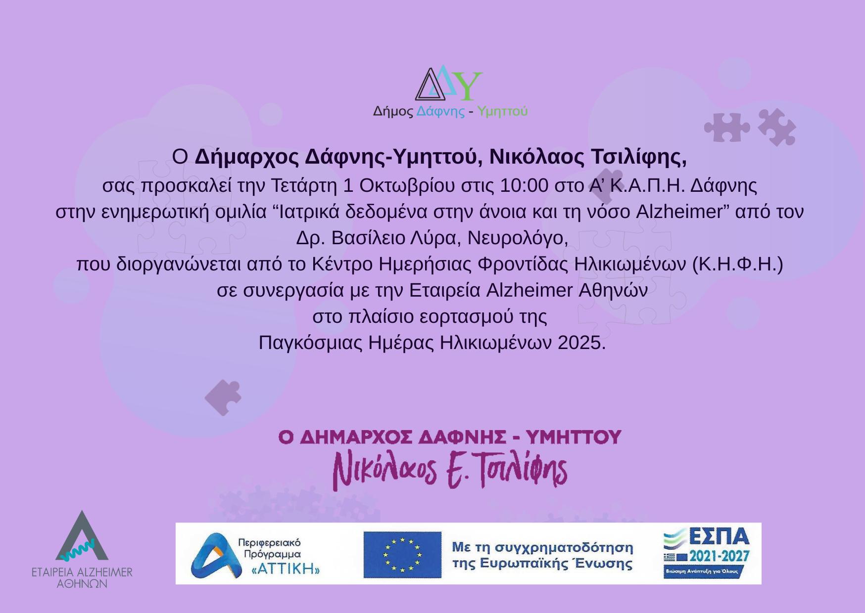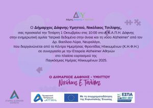 Το Κέντρο Ημερήσιας Φροντίδας Ηλικιωμένων (Κ.Η.Φ.Η.) του Δήμου Δάφνης-Υμηττού, στο πλαίσιο του εορτασμού της Παγκόσμιας Ημέρας Ηλικιωμένων 2025, διοργανώνει μία δράση για τη νόσο του Alzheimer, σε συνεργασία με την Εταιρεία Alzheimer Αθηνών.
