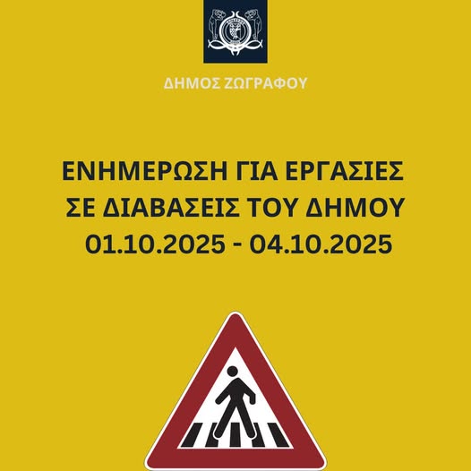 Ο Δήμος Ζωγράφου ανακοίνωσε πως η Τεχνική Υπηρεσία θα προχωρήσει σε επαναχρωματισμό και ανανέωση των διαβάσεων πεζών από την Τετάρτη 1 Οκτωβρίου εως το Σάββατο 4 Οκτωβρίου.