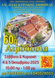 Ο Ιερός Ναός Αγίας Κυριακής που βρίσκεται στον Δήμο Παλαιού Φαλήρου, διοργανώνει την 60η Αιμοδοσία του, το πρώτο Σαββατοκύριακο του Οκτωβρίου.