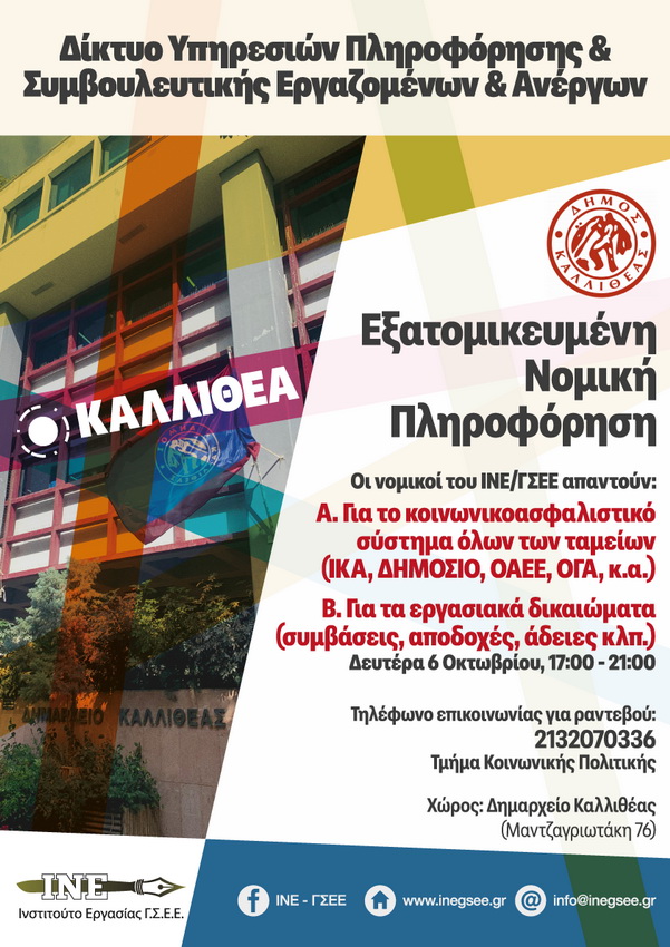 Σε συνέχεια της συνεργασία του Δήμου Καλλιθέας με το Ινστιτούτο Εργασίας της ΓΣΕΕ, παρέχεται στους δημότες και πολίτες δωρεάν εξατομικευμένη νομική συμβουλευτικής και πληροφόρησης από νομικούς του ΙΝΕ/ΓΣΕΕ, οι οποίοι θα μπορούν να τους απαντήσουν και να τους ενημερώσουν για το κοινωνικοασφαλιστικό σύστημα όλων των ταμείων ( ΙΚΑ, ΔΗΜΟΣΙΟ, ΟΑΕΕ, ΟΓΑ κ.α.) και για τα εργασιακά τους δικαιώματα (συμβάσεις, αποδοχές, άδειες κλπ.).