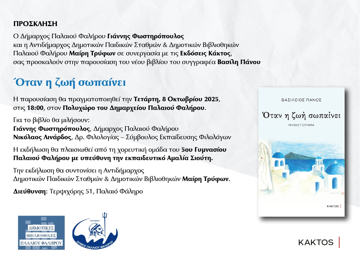Ο Δήμος Παλαιού Φαλήρου, σε συνεργασία με τον Εκδοτικό Οίκο Κάκτο, διοργανώνουν την παρουσίαση του βιβλίου του Βασίλη Πάνου με τίτλο «Όταν η ζωή σωπαίνει».