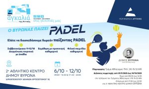 Έως και τις 12 Οκτωβρίου 2025, το 2ο Αθλητικό Κέντρο Δήμου Βύρωνα (Αρχιεπισκόπου Αθηνών Χρυσοστόμου 15) μετατρέπεται σε κέντρο δράσης για το δημοφιλές άθλημα PADEL, στο πλαίσιο της διοργάνωσης «Ο ΒΥΡΩΝΑΣ ΠΑΙΖΕΙ PADEL».