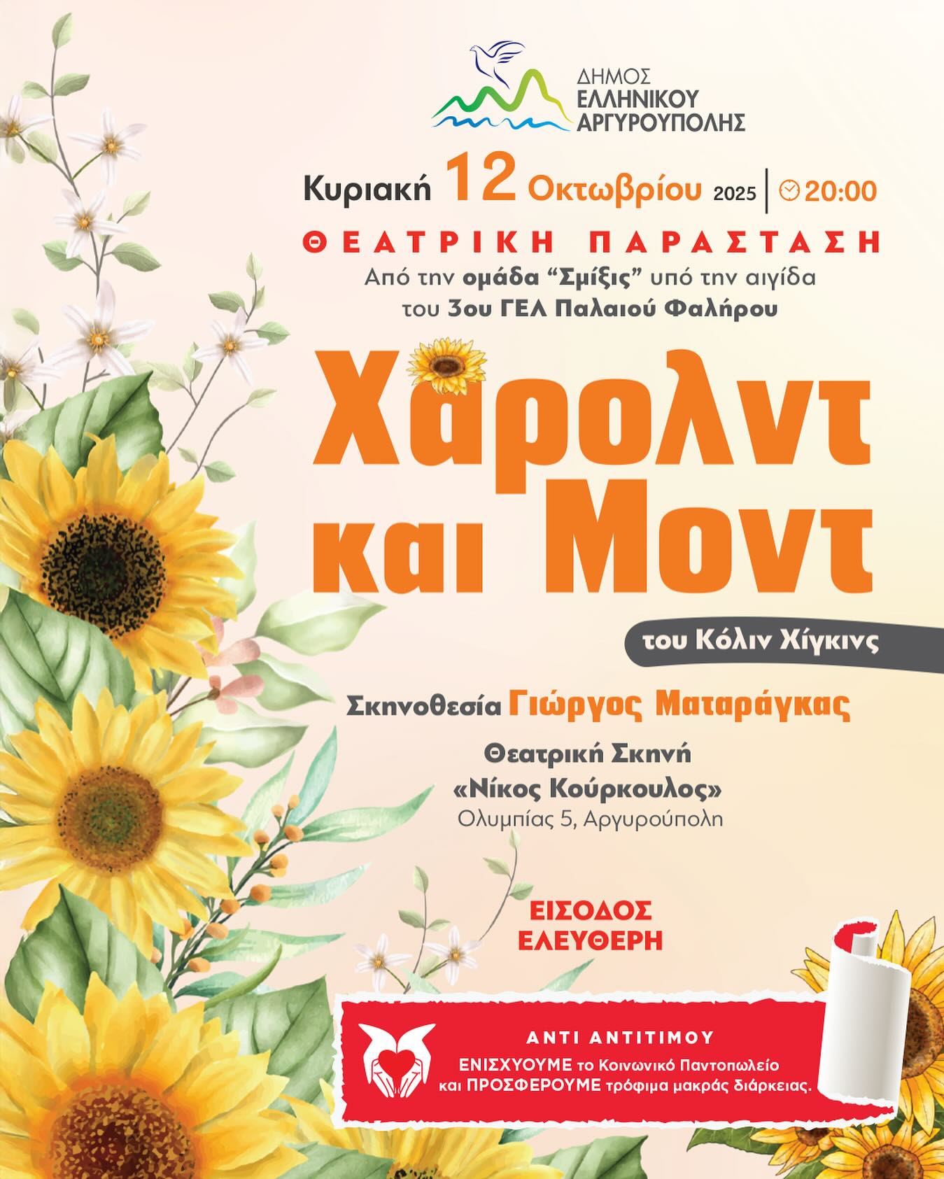 Την Κυριακή 12 Οκτωβρίου και ώρα 20:00 στη Θεατρική Σκηνή «Νίκος Κούρκουλος» (Ολυμπίας 5, Αργυρούπολη), η ομάδα Σμίξις, υπό την αιγίδα του 3ου ΓΕΛ Παλαιού Φαλήρου, παρουσιάζει σε σκηνοθετική καθοδήγηση του Γιώργου Ματαράγκα, το εμβληματικό έργο του Κόλιν Χίγκινς «Χάρολντ και Μοντ».