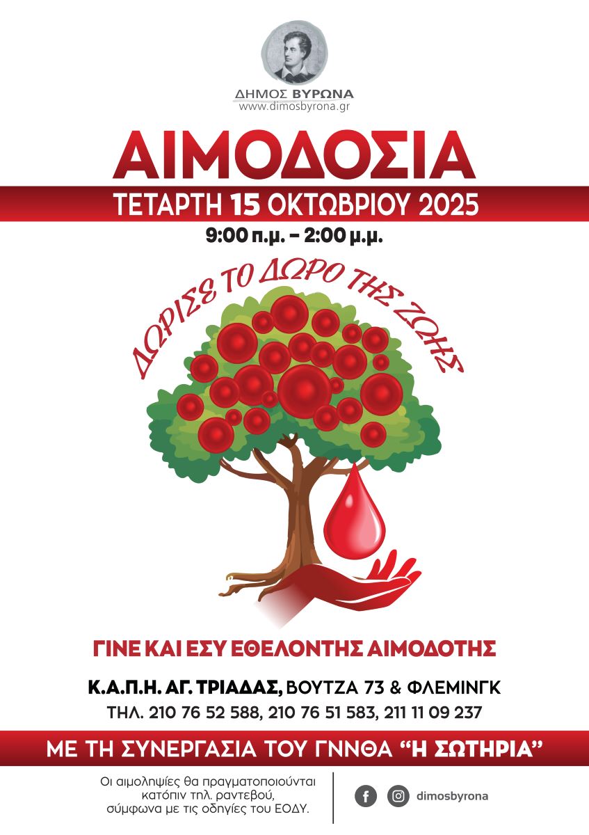 Ο Δήμος Βύρωνα, σε συνεργασία με το Γ.Ν.Ν.Θ.Α «Η ΣΩΤΗΡΙΑ», προσκαλεί τους κατοίκους και τους πολίτες να συμμετάσχουν στη νέα Εθελοντική Αιμοδοσία, ενισχύοντας τη Δημοτική Τράπεζα Αίματος και στηρίζοντας όσους έχουν ανάγκη.