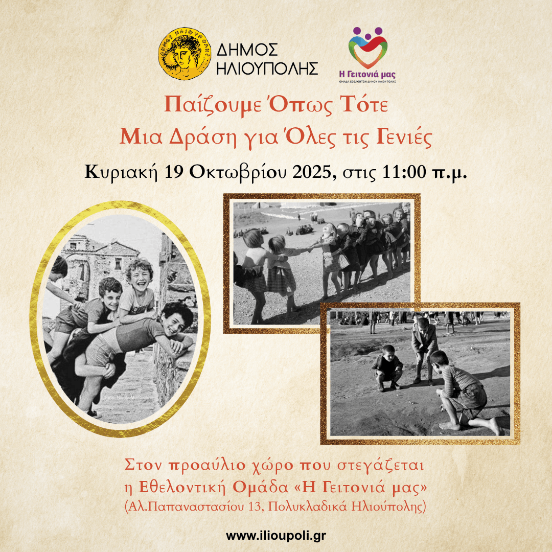 Η Εθελοντική Ομάδα «Η Γειτονιά μας» του Δήμου Ηλιούπολης, με τη δύναμη και τον ενθουσιασμό των εθελοντών της, οργανώνει τη δράση «Παίζουμε Όπως Τότε» την Κυριακή 19 Οκτωβρίου 2025, στις 11:00 π.μ., στον προαύλιο χώρο όπου στεγάζεται η Εθελοντική Ομάδα «Η Γειτονιά μας» (Αλεξάνδρου Παπαναστασίου 13, Πολυκλαδικά Ηλιούπολης).