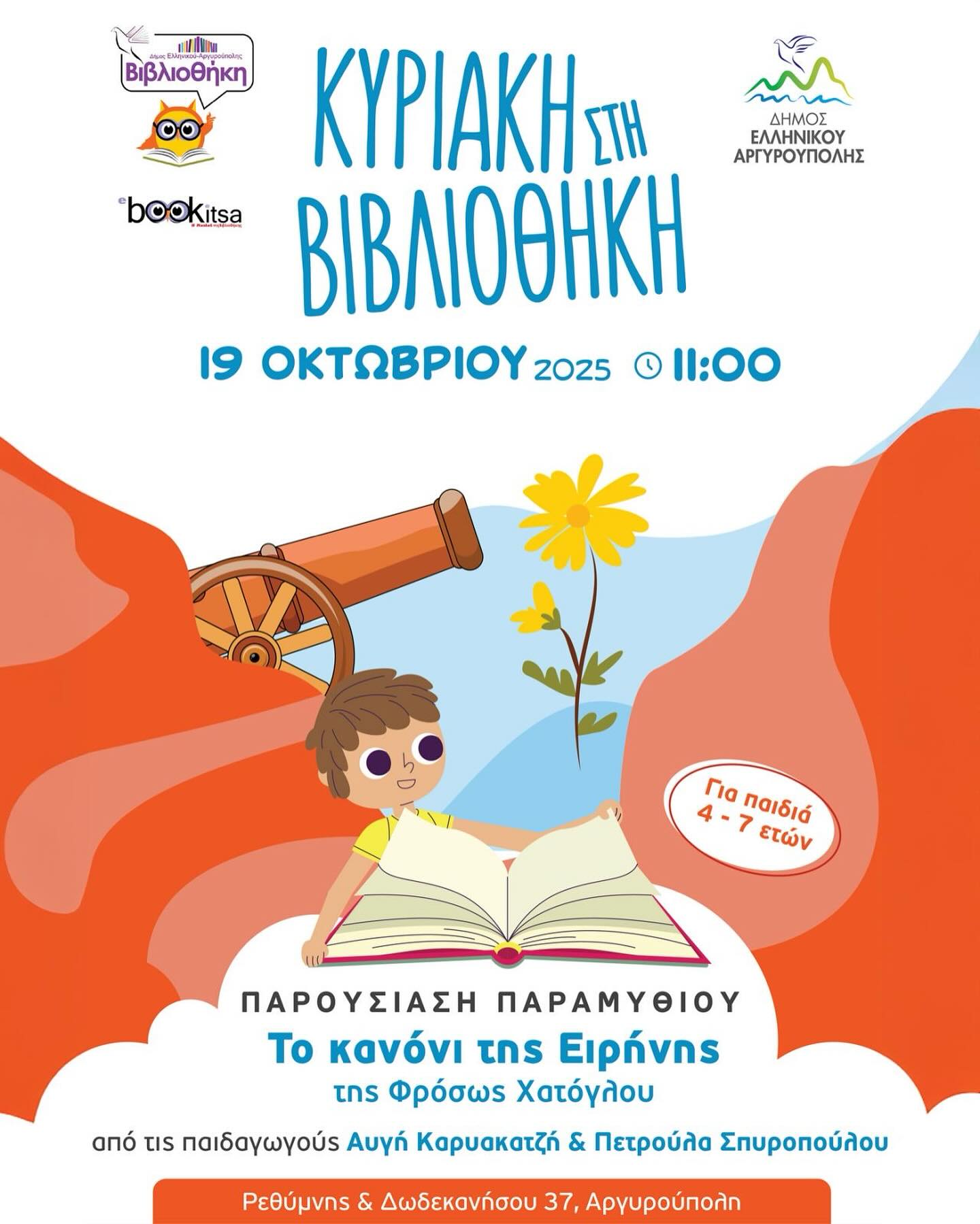 Αυτή την Κυριακή, 19 Οκτωβρίου και ώρα 11:00 π.μ., οι μικροί φίλοι (4-7 ετών) θα γνωρίσουν το αγαπημένο παραμύθι της Φρόσως Χατόγλου, «Το Κανόνι της Ειρήνης», σε μια διαδραστική παρουσίαση από τις εκπαιδευτικούς Αυγή Καρυακατζή και Πετρούλα Σπυροπούλου, στη Δημοτική Βιβλιοθήκη Ελληνικού-Αργυρούπολης (Ρεθύμνης & Δωδεκανήσου 37, Αργυρούπολη).
