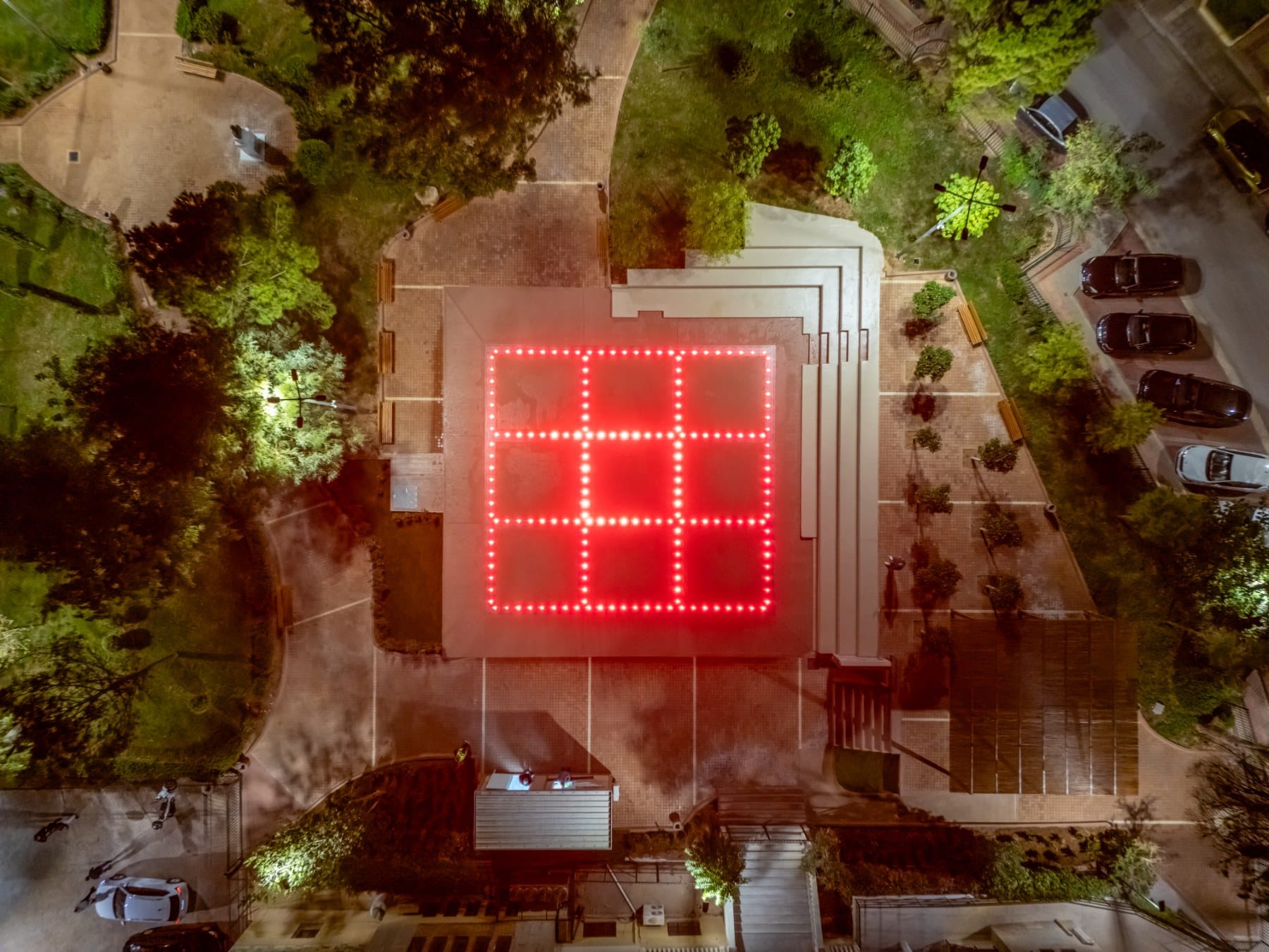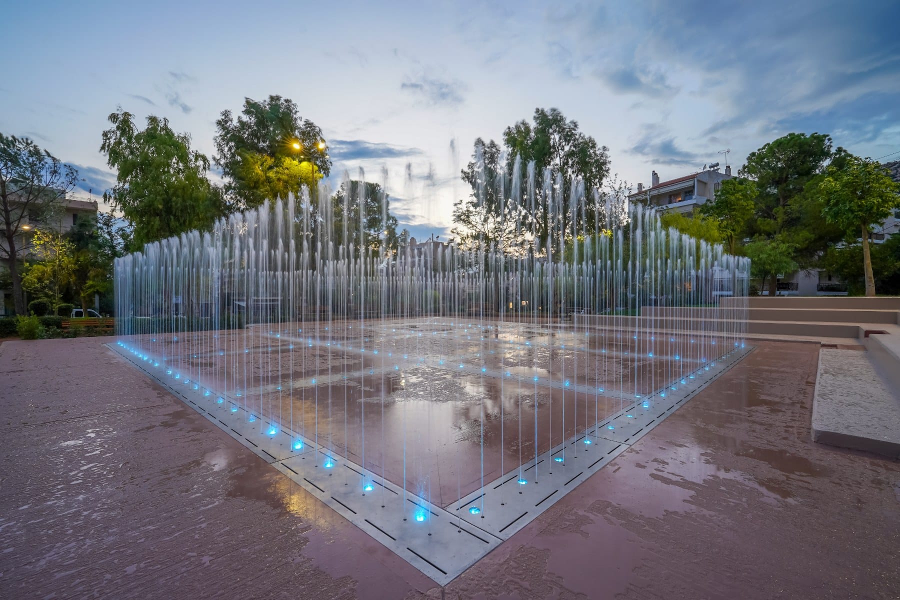 Πίδακες νερού πετάγονται από το δάπεδο και, για την παιδική φαντασία, δημιουργούν έναν λαβύρινθο, μέσα στον οποίο τα παιδιά παίζουν, τρέχουν και βρέχονται.