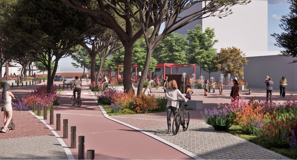 Τα υφιστάμενα δέντρα θα διατηρηθούν και το πράσινο θα ενισχυθεί σημαντικά, με φυτεύσεις δέντρων μεγάλης ανάπτυξης και καλλωπιστικών φυτών. Η χρήση ανακυκλώσιμων και οικολογικών υλικών – όπως βοτσαλωτά δάπεδα και κυβόλιθοι υψηλής θερμικής απορροφητικότητας – υποστηρίζει τη βιοκλιματική αναβάθμιση της πλατείας και δημιουργεί ευνοϊκό μικροκλίμα, ακολουθώντας τις αρχές της αειφόρου ανάπτυξης.
