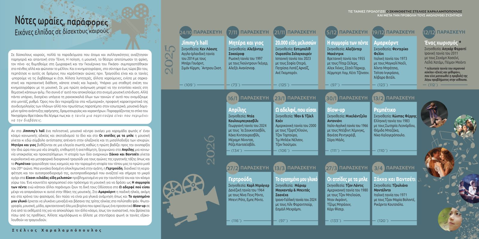 Για τη νέα σεζόν, οι 13 εμβληματικές ταινίες, επιλεγμένες από τον σκηνοθέτη Στέλιο Χαραλαμπόπουλο, αντιπροσωπεύουν την 7η τέχνη διαχρονικά και σε παγκόσμιο επίπεδο. Η θεματική ενότητα που συνθέτουν, με τίτλο «Νότες ωραίες, παράφορες… Εικόνες ελπίδας σε δίσεκτους καιρούς», αναδεικνύει τη διαχρονική σχέση κινηματογράφου – μουσικής, τη μουσικότητα ως δομικό στοιχείο των έργων, αλλά και τις διεξόδους που παρέχει η μουσική όταν όλα φαίνονται μάταια…