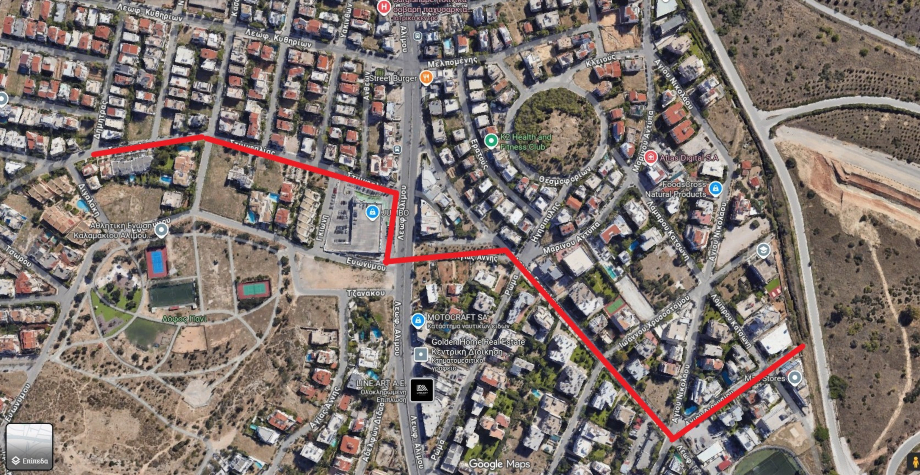 «Ένα καινούριο έργο αντιπλημμυρικής θωράκισης της πόλης μας ξεκινάει τις ημέρες αυτές. Στη φωτογραφία μπορείτε να δείτε με κόκκινο χρώμα τη διαδρομή του αγωγού, από την οδό Δήμητρας μέχρι το ρέμα Τραχώνων.