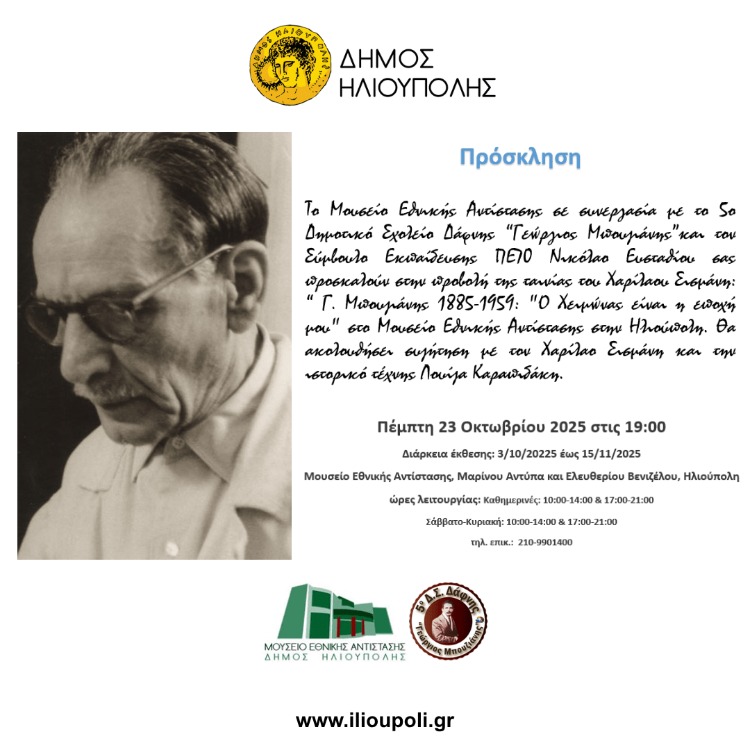 Το Μουσείο Εθνικής Αντίστασης Ηλιούπολης, σε συνεργασία με το 5ο Δημοτικό Σχολείο Δάφνης «Γεώργιος Μπουζιάνης» και τον Σύμβουλο Εκπαίδευσης ΠΕ 70 Νικόλαο Ευσταθίου, στο πλαίσιο της έκθεσης ζωγραφικής εικαστικών καλλιτεχνών «…με αφορμή τον Γιώργο Μπουζιάνη», που φιλοξενεί, διοργανώνει μια ειδική εκδήλωση-προβολή αφιερωμένη στον μεγάλο Έλληνα εξπρεσιονιστή Γιώργο Μπουζιάνη, στις 23 Οκτώβρη ημέρα που συμπληρώνονται 66 χρόνια από τον θάνατο του (23 Οκτωβρίου 1959).
