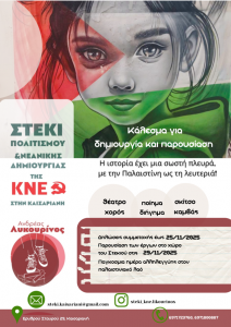 Το Στέκι καλεί για δημιουργία έργων εικαστικών, παραστατικών (θεατρικό, χορογραφία) και λογοτεχνικών (διήγημα, ποίημα) που θα παρουσιαστούν στον χώρο του Στεκιού, Ερυθρού Σταυρού 29 στην Καισαριανή, το Σάββατο 29 Νοεμβρίου 2025 (Παγκόσμια ημέρα αλληλεγγύης στον παλαιστινιακό λαό).