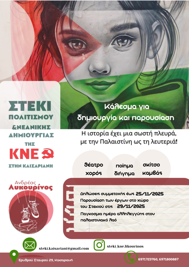 Το Στέκι Πολιτισμού και νεανικής δημιουργίας της ΚΝΕ στην Καισαριανή «Ανδρέας Λυκουρίνος», παίρνοντας τη σκυτάλη από τις εκδηλώσεις του 51ου Φεστιβάλ ΚΝΕ «Οδηγητή», από την μεγάλη υπαίθρια εικαστική έκθεση για την Παλαιστίνη, κάνει ανοιχτό κάλεσμα σε κάθε νέα και νέο δημιουργό, να εκφράσει την αλληλεγγύη του στον αγώνα του παλαιστινιακού λαού.
