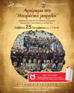 Την εκδήλωση θα ολοκληρώσει το χορευτικό τμήμα της Αδελφότητας Ηπειρωτών Αργυρούπολης, παρουσιάζοντας παραδοσιακούς χορούς από την Ήπειρο, σε ένα γνήσιο λαογραφικό ταξίδι στις ρίζες και τα ήθη του τόπου.