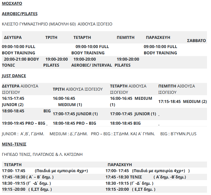 Τα παιδικά προγράμματα είναι: Ταε-κβο-Ντο, Μίνι Tένις, Μοντέρνος χορός (Just Dance).