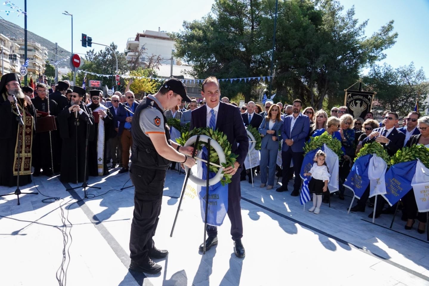 Ακολούθησε επιμνημόσυνη δέηση και κατάθεση στεφάνων στο Μνημείο Ηρώων στην πλατεία Αγίου Τρύφωνα. Ο εορτασμός της εθνικής επετείου κορυφώθηκε με τη μεγάλη μαθητική παρέλαση, που πραγματοποιήθηκε επί της οδού Γ. Γεννηματά.