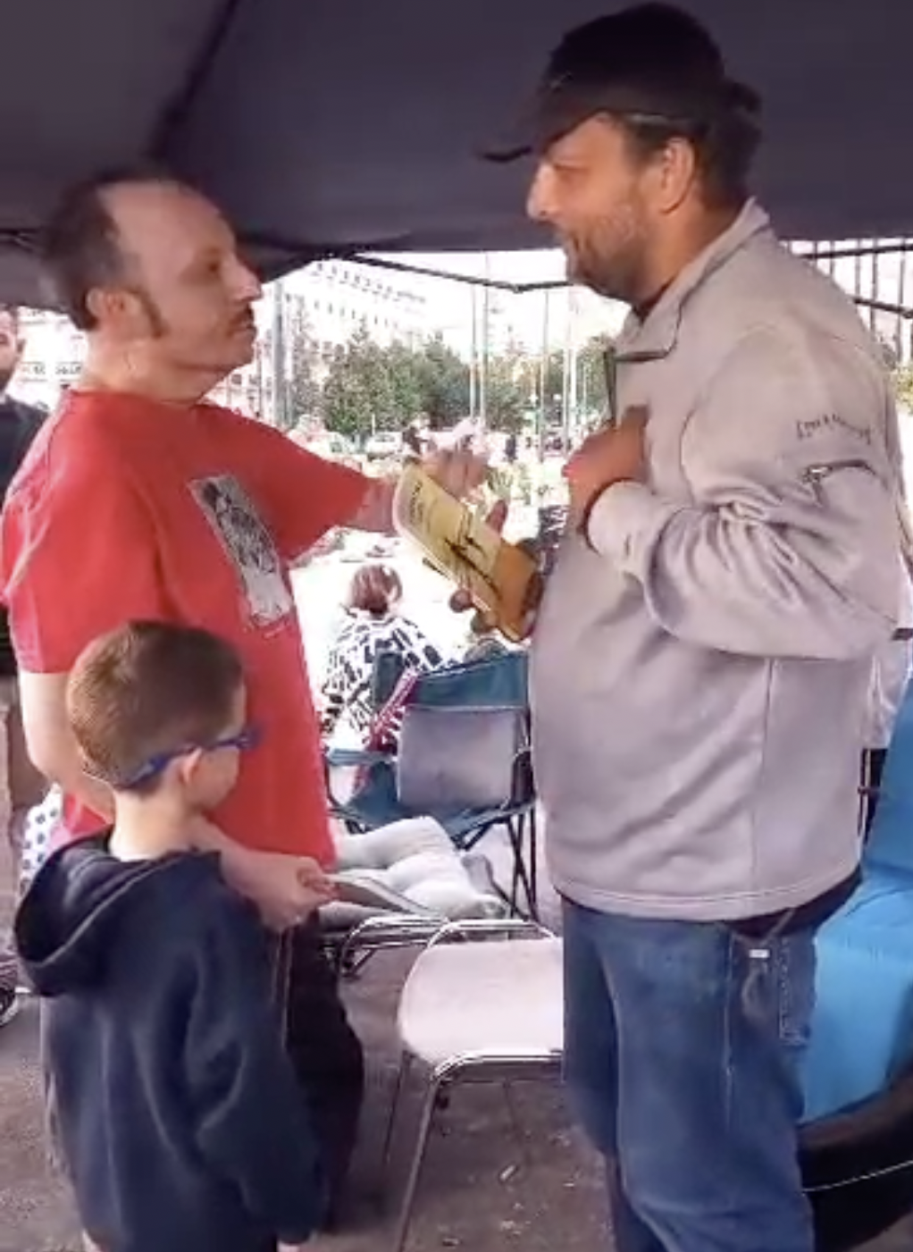 Όταν βγήκα από το νοσοκομείο, που είχα πάθει κάποιες κρίσεις επιληψίας, επέλεξα να πάω στον Πάνο Ρούτσι στο Σύνταγμα, μαζί με το Στέλιο και τη Μαρίνα, ως μια μαρτυρία στον Στέλιο ότι στεκόμαστε αλληλέγγυοι στους ανθρώπους που αγωνίζονται για τα παιδιά τους, του εξήγησα τα πάντα, γιατί πλέον δεν του κρύβω τίποτα: ακριβώς τι έχει συμβεί που ήξερε ήδη για τα Τέμπη, γιατί πήγαμε, τι ζητάει αυτός ο πατέρας. Πήγαμε λοιπόν και του δώσαμε το πρώτο βιβλίο στον Πάνο Ρούτσι· εκεί κατάλαβα τι φοβερή φιγούρα αγωνιστή αποτελεί, λαϊκού και πηγαίου. Κατάλαβα ότι όλοι οι άνθρωποι που αγωνίζονται στη ζωή τους, χρειάζονται και υποστήριξη και αλληλεγγύη, ότι δεν ξέρουμε ποιος δίνει δύναμη σε ποιόν.