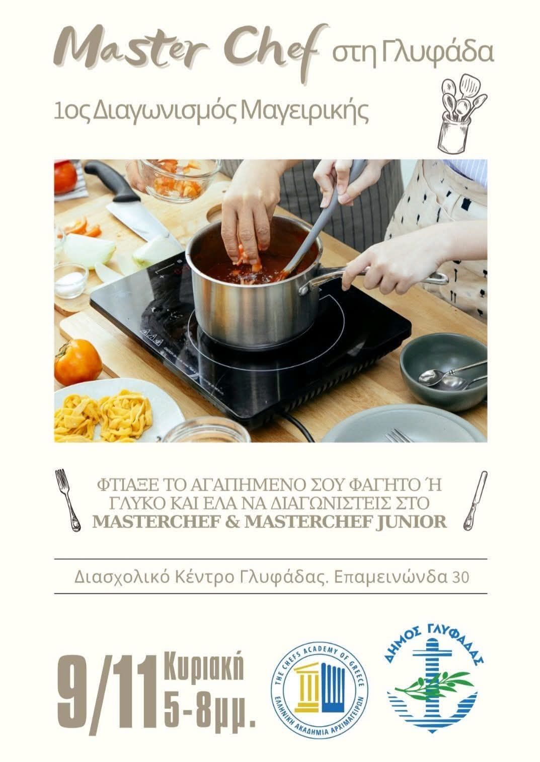 Ο Δήμος Γλυφάδας και η Ελληνική Ακαδημία Αρχιμαγείρων διοργανώνουν μία εκδήλωση με υπέροχα πιάτα, τον 1ο Διαγωνισμό Masterchef και Masterchef Junior, όπου οι συμμετέχοντες θα έχουν την ευκαιρία να δοκιμάσουν και να ψηφίσουν τα καλύτερα.