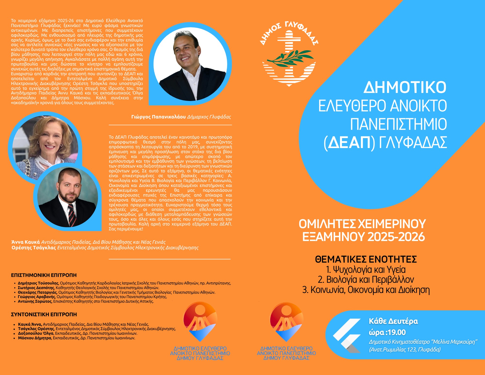 «Το χειμερινό εξάµηνο 2025-26 στο Δημοτικό Ελεύθερο Ανοικτό Πανεπιστήμιο Γλυφάδας ξεκίνησε! Με ευρύ φάσµα γνωστικών αντικειµένων. Με διαπρεπείς επιστήµονες που συµµετέχουν αφιλοκερδώς. Με ενθουσιασµό από πλευράς της δηµοτικής µας αρχής. Κυρίως, όµως, µε το δικό σας ενδιαφέρον και την επιθυµία σας να αντλείτε συνεχώς νέες γνώσεις και να αξιοποιείτε µε τον καλύτερο δυνατό τρόπο τον ελεύθερο χρόνο σας.