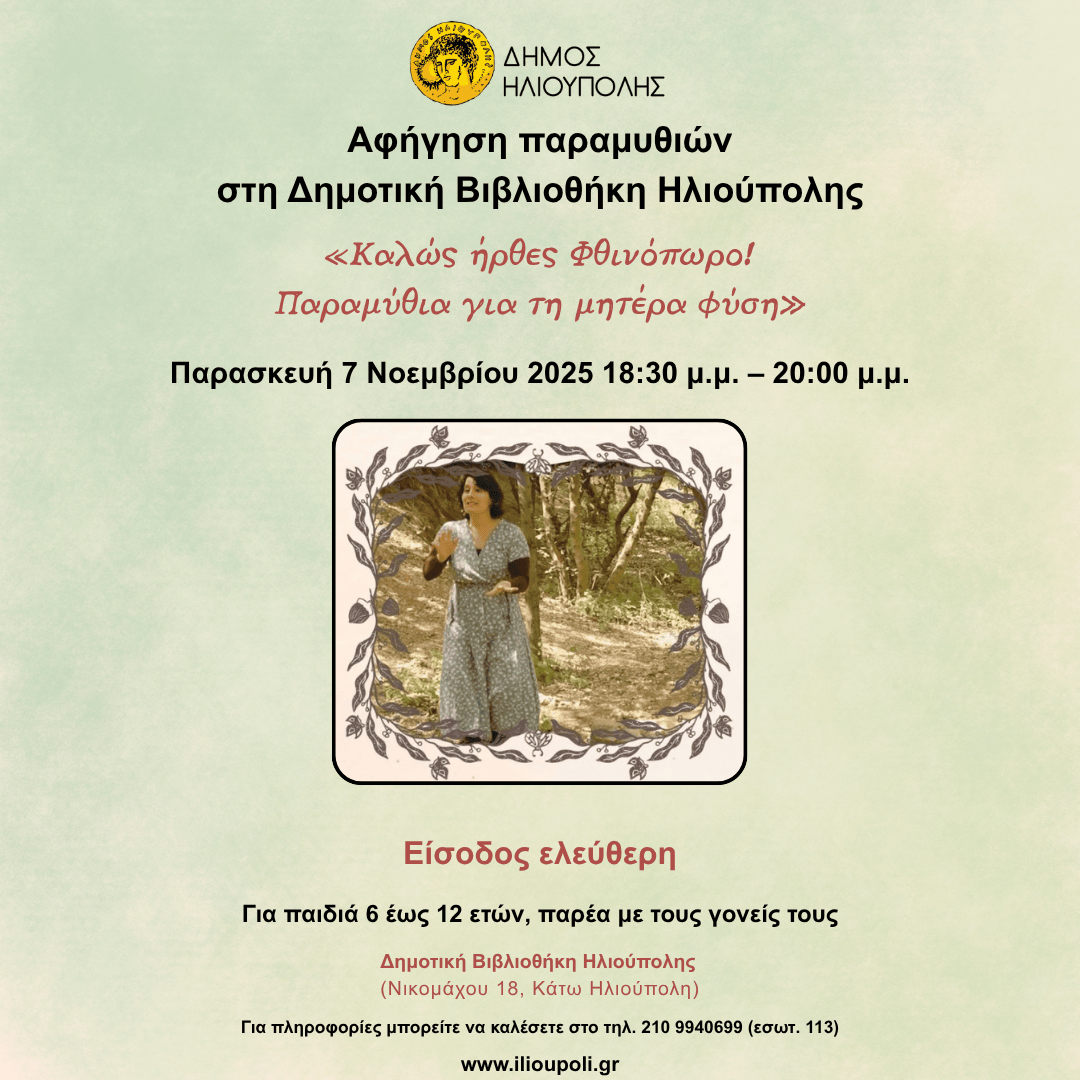 Την Παρασκευή 7 Νοεμβρίου 2025, από τις 18:30 – 20:00, η Δημοτική Βιβλιοθήκη του Δήμου Ηλιούπολης, θα μεταμορφωθεί σε έναν κόσμο παραμυθιού, με την αφήγηση ιστοριών σχετικά με την εποχή του φθινοπώρου και παραμύθια για τη φύση, με την εμψυχώτρια Κατερίνα-Θάλεια Νάκου.