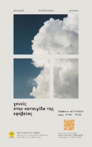 Το δωρεάν βιωματικό εργαστήριο για γονείς παιδιών στην εφηβεία (ηλικίες από 12 έως και 17 ετών) τιτλοφορείται «Γονείς στην καταιγίδα της εφηβείας» και επιχειρεί μέσα από συζήτηση και παιχνίδια, να δει την εφηβεία όχι ως ένα πρόβλημα που καλούμαστε να λύσουμε, αλλά ως μια διεργασία που θέλουμε να κατανοήσουμε, να φροντίσουμε και να χαρούμε.