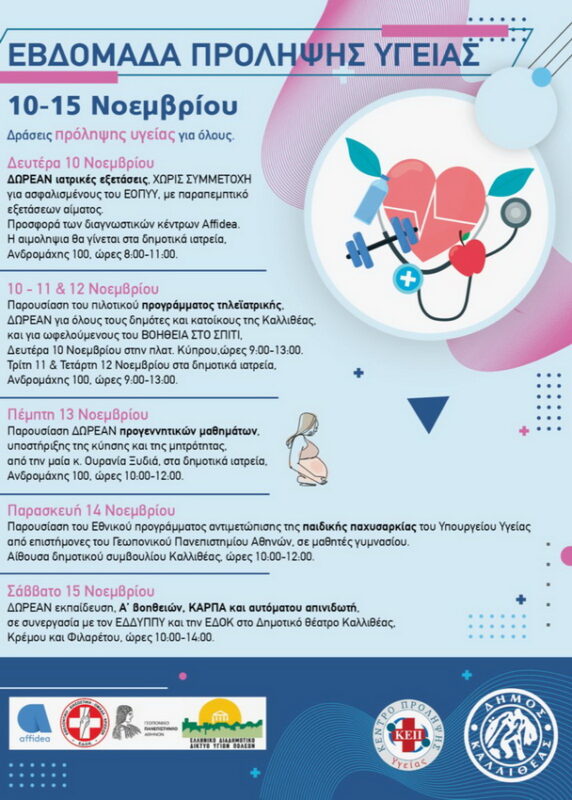 Ξεκίνησε η Εβδομάδα Πρόληψης Υγείας στην Καλλιθέα, που θα διαρκέσει από τις 10 έως 15 Νοεμβρίου και είναι αφιερωμένη από τον Δήμο στην Υγεία.