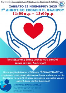 Ο Σύλλογος Γονέων & Κηδεμόνων του 7ου Δημοτικού Σχολείου Παλαιού Φαλήρου, μαζί με γονιό του σχολείου, την Κατερίνα Ελ Αζάμπ, διοργανώνουν μια ιδιαίτερα σημαντική εθελοντική δράση, σε συνεργασία με το «ΟΡΑΜΑ ΕΛΠΙΔΑΣ».