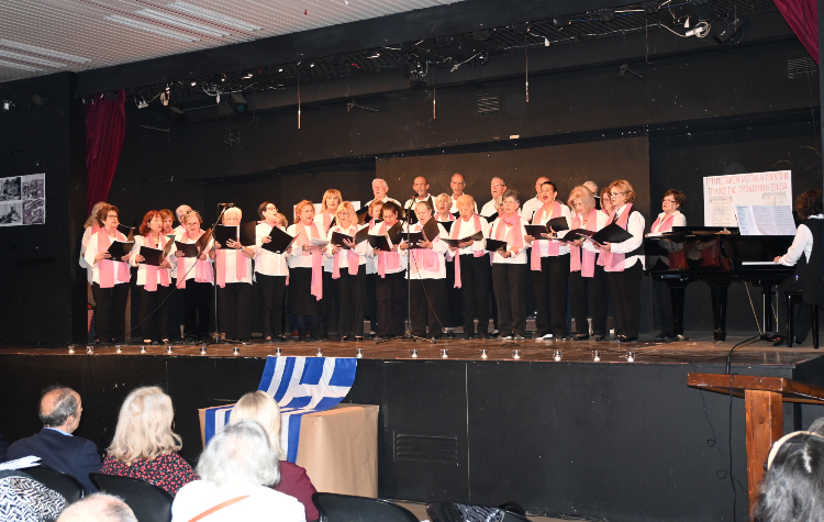 Τραγούδια που έχουν συνδεθεί αναπόσπαστα με τα γεγονότα της περιόδου ερμήνευσε η χορωδία των ΚΑΠΗ υπό τη διεύθυνση της Δώρας Ζαμπέλη, ενώ η εκδήλωση ολοκληρώθηκε με προσκλητήριο νεκρών και τον εθνικό ύμνο.