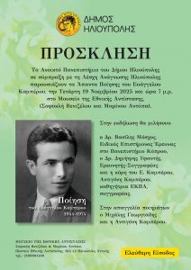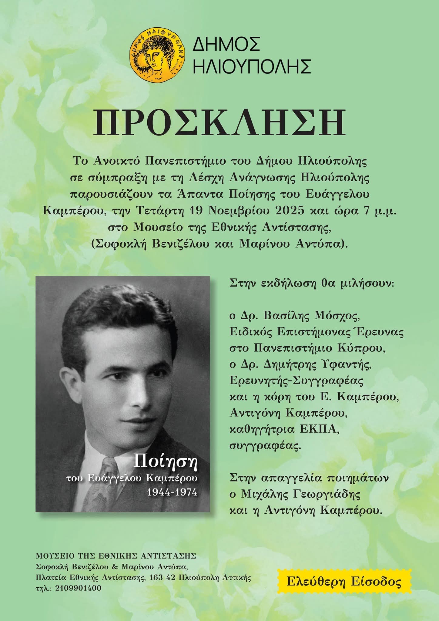 Αυτήν την εβδομάδα, το Ανοιχτό Πανεπιστήμιο, σε σύμπραξη με τη Λέσχη Ανάγνωσης Ηλιούπολης παρουσιάζουν τα «Άπαντα Ποίησης του Ευάγγελου Καμπέρου», την Τετάρτη 19 Νοεμβρίου και ώρα 7 μ.μ. στο Μουσείο της Εθνικής Αντίστασης (Σοφοκλή Βενιζέλου και Μαρίνου Αντύπα), με ελεύθερη είσοδο.