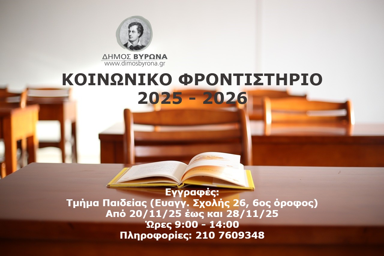 Ο Δήμος Βύρωνα θα λειτουργήσει και φέτος τον κοινωνικό θεσμό ενισχυτικής διδασκαλίας, με τον τίτλο «Κοινωνικό Φροντιστήριο» που αφορά στα παιδιά της Β’βάθμιας εκπαίδευσης, που επιθυμούν να παρακολουθήσουν δωρεάν μαθήματα.