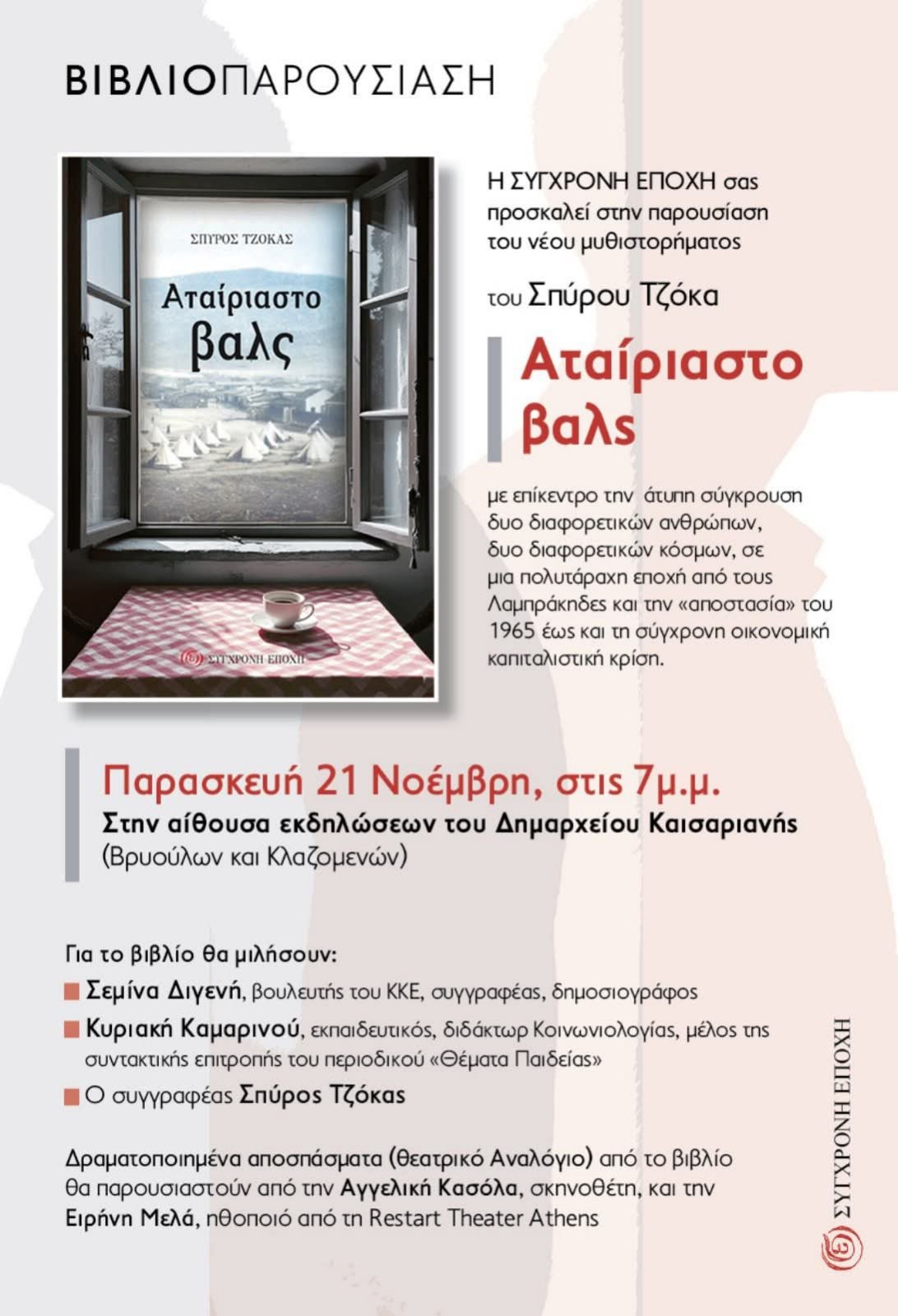 Την Παρασκευή 21 Νοεμβρίου και ώρα 19:00, στην αίθουσα εκδηλώσεων του Δημαρχείου Καισαριανής, θα πραγματοποιηθεί η παρουσίαση του νέου μυθιστορήματος του πανεπιστημιακού – συγγραφέα και πρώην δήμαρχου Καισαριανής Σπύρου Τζόκα, με τίτλο «Αταίριαστο βαλς».