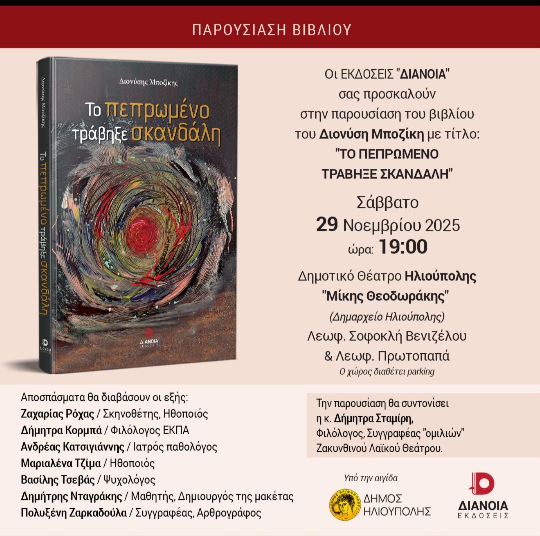 Το Σάββατο 29 Νοεμβρίου 2025, στις 19:00, το Δημοτικό Θέατρο Ηλιούπολης «Μίκης Θεοδωράκης» (Λεωφόρος Σοφοκλή Βενιζέλου & Κουντουριώτου), θα φιλοξενήσει την παρουσίαση του νέου βιβλίου του Διονύση Μποζίκη, με τίτλο «Το πεπρωμένο Τράβηξε Σκανδάλη», που κυκλοφορεί από τις Εκδόσεις ΔΙΑΝΟΙΑ.