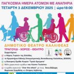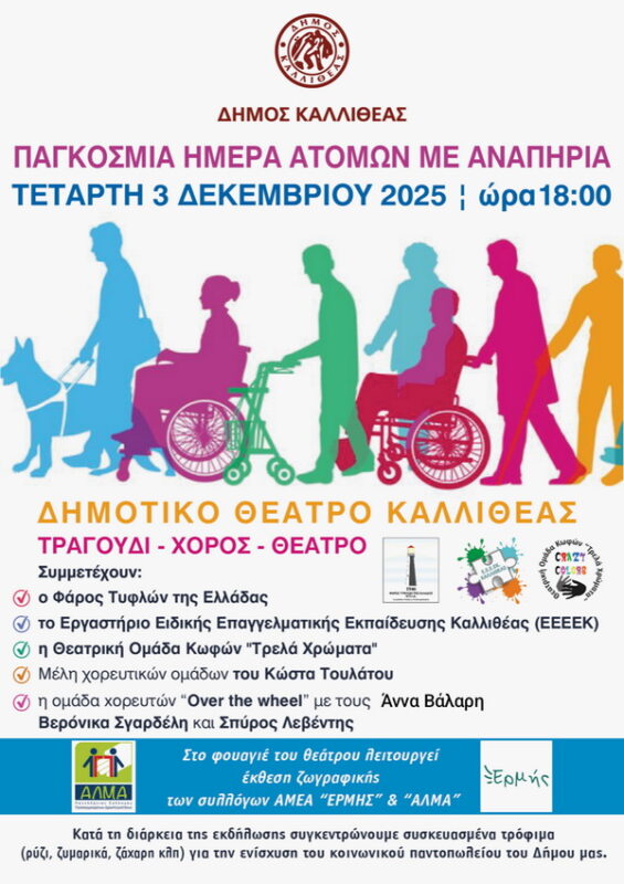 Η Διεύθυνση Κοινωνικής Πολιτικής του Δήμου Καλλιθέας τιμά την Παγκόσμια Ημέρα Ατόμων με Αναπηρία με μια πολύπλευρη καλλιτεχνική εκδήλωση, αποδεικνύοντας πως ο πολιτισμός δεν γνωρίζει αποκλεισμούς, ότι η τέχνη τους αγκαλιάζει όλους και ότι η δημιουργικότητα δεν έχει όρια.