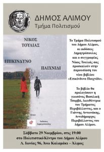 Το Τμήμα Πολιτισμού του Δήμου Αλίμου και οι Εκδόσεις Δημητρόπουλος διοργανώνουν την παρουσίαση του νέου βιβλίου του συγγραφέα Νίκου Τουλιά, με τίτλο: «Επικίνδυνο Παιχνίδι».