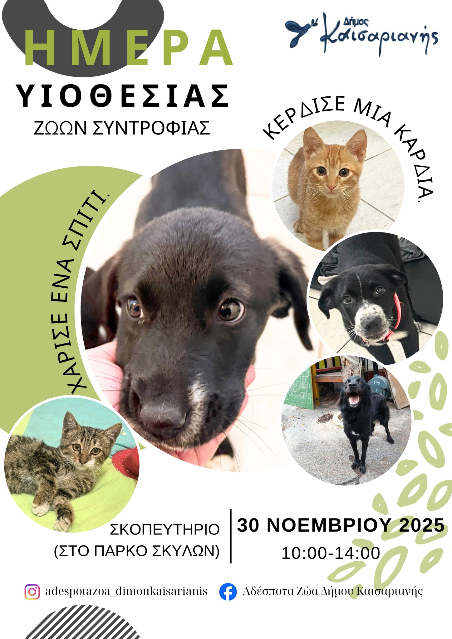 Η Υπηρεσία για τα Αδέσποτα Ζώα του Δήμου Καισαριανής διοργανώνει μία Ημέρα Υιοθεσίας, για τα  σκυλάκια και τα γατάκια της πόλης που βρίσκονται στην φροντίδα του Δήμου που αναζητούν την παντοτινή τους οικογένειά, με την περιγραφή «Χαλαρή Κυριακή, Χνουδωτές Αγκαλιές και Καφές».