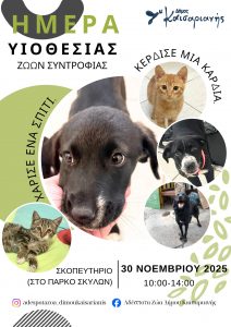Η δράση υιοθεσίας θα πραγματοποιηθεί την Κυριακή 30 Νοεμβρίου, από τις 10 π.μ. έως τις 14.00 μ.μ., στο  Πάρκο σκύλων που βρίσκεται στο Σκοπευτήριο  Καισαριανής.