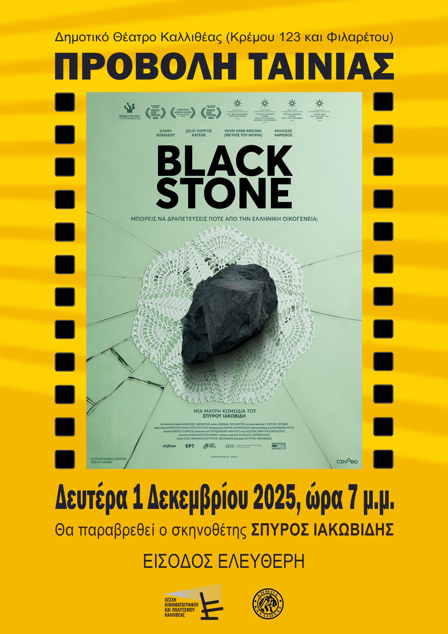 Συνεχίζεται το αφιέρωμα στον σύγχρονο ελληνικό κινηματογράφο, από την Λέσχη Κινηματογράφου και Πολιτισμού Καλλιθέας, με την προβολή της πολυβραβευμένης ελληνικής ταινίας του Σπύρου Ιακωβίδη, με τίτλο «Black Stone» (2022), με πρωταγωνιστές Spiros Jacovides με την Ελένη Κοκκίδου.