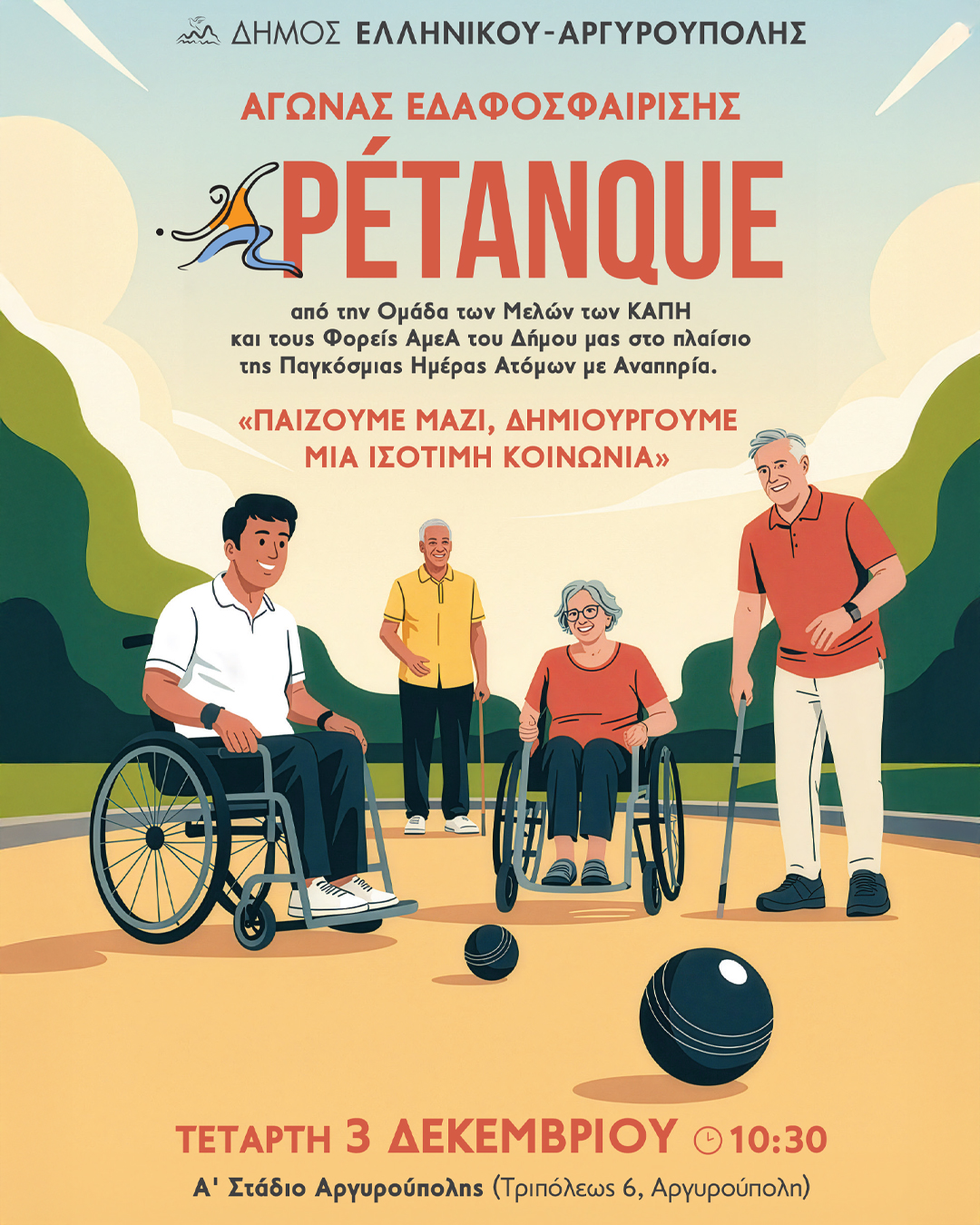 O Δήμος Ελληνικού – Αργυρούπολης, τιμώντας την Παγκόσμια Ημέρα Ατόμων με Αναπηρία, διοργανώνει έναν αγώνα Εδαφοσφαίρισης (Petanque) από την Ομάδα των Μελών των ΚΑΠΗ και τους φορείς ΑμεΑ της πόλης, με σύνθημα «Παίζουμε μαζί, Δημιουργούμε μια ισότιμη κοινωνία».