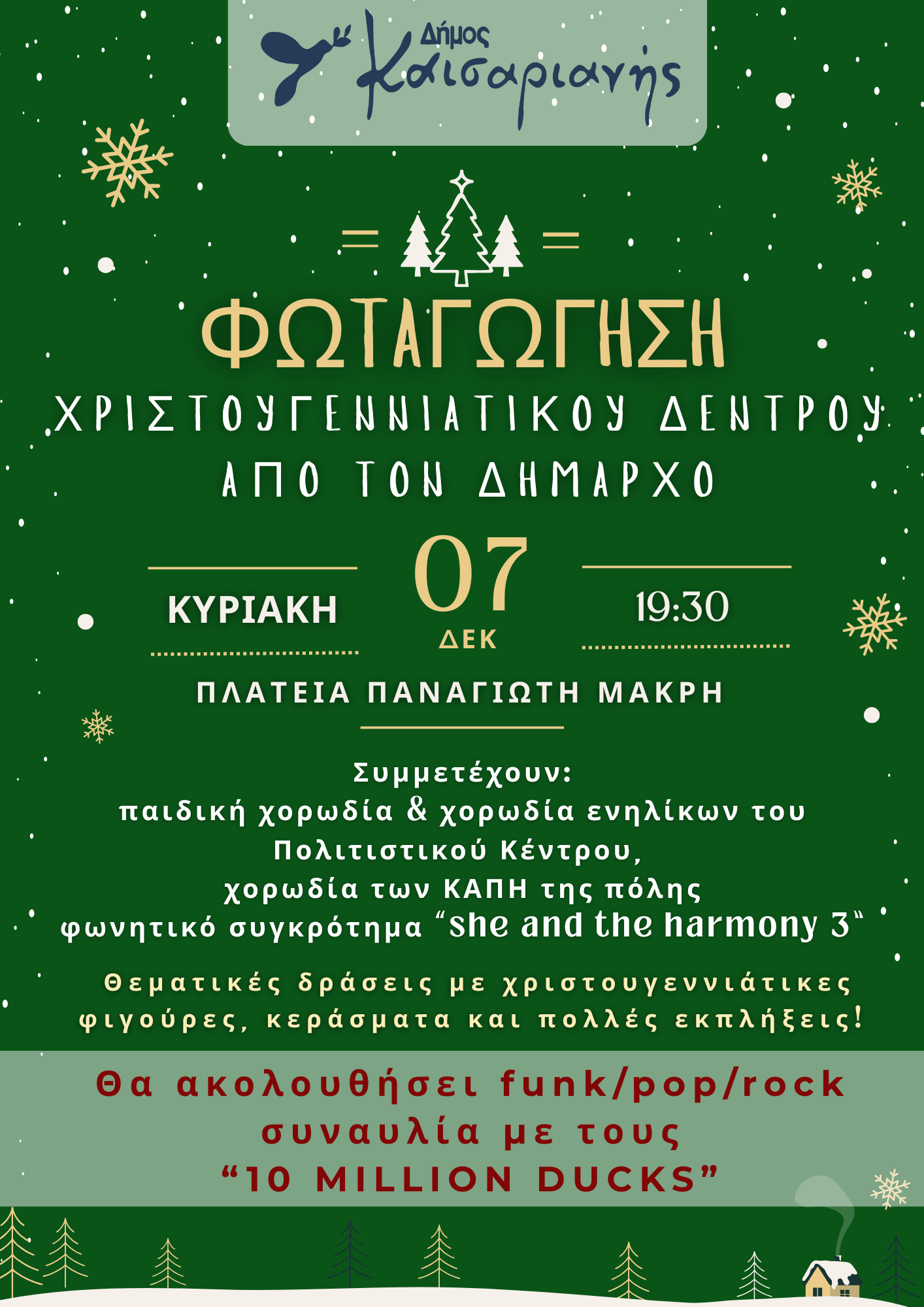 Οι χριστουγεννιάτικες εκδηλώσεις του Δήμου Καισαριανής ξεκινούν με τη φωταγώγηση του χριστουγεννιάτικου δέντρου από τον δήμαρχο Ηλία Σταμέλο, την Κυριακή 7 Δεκεμβρίου στις 7:30 μμ. στην Πλατεία Δημάρχου Παναγιώτη Μακρή.