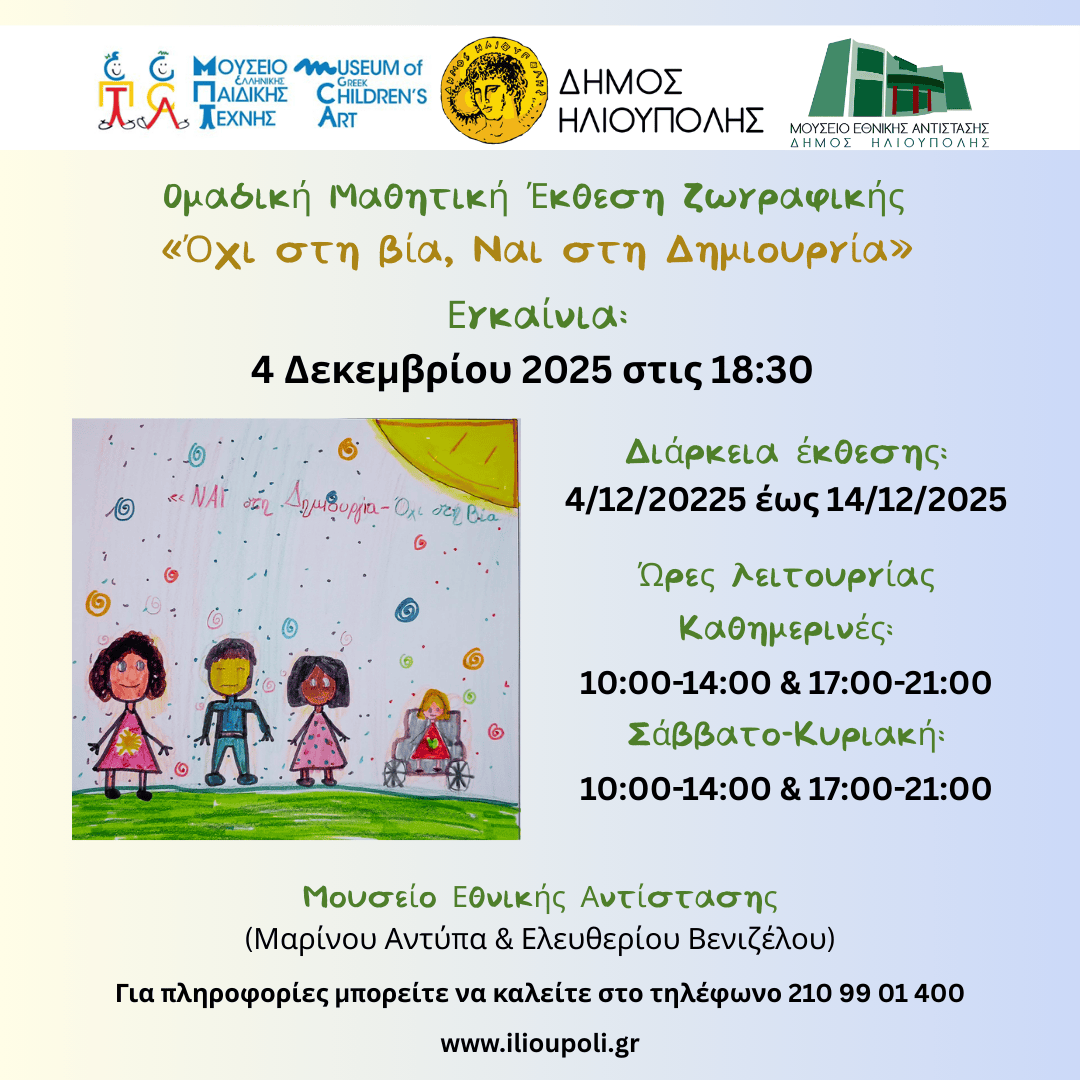 Στο Μουσείο Εθνικής Αντίστασης θα φιλοξενηθεί η ομαδική έκθεση ζωγραφικής μαθητών/τριών από Δημοτικά σχολεία της Ηλιούπολης (1ο, 2ο, 4ο, 5ο, 8ο, 11ο, 12ο, 13ο, 15ο, 17ο, 20ο ) και του Υμηττού (1ο & 2ο), με τίτλο: «Όχι στη Βία, Ναι στη Δημιουργία», με ελεύθερη είσοδο.