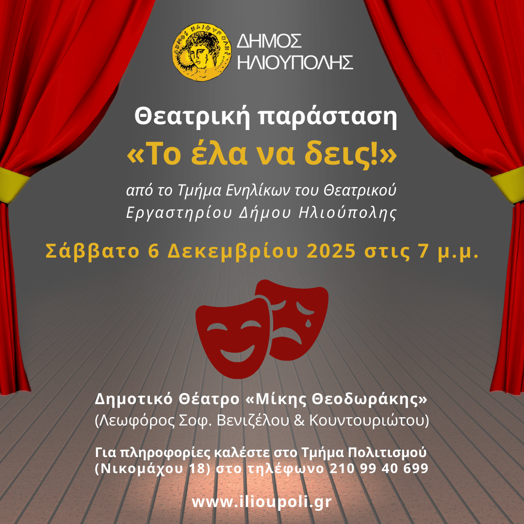 Η παράσταση πραγματοποιείται το Σάββατο, 6 Δεκεμβρίου, στις 7 μ.μ., στο Δημοτικό Θέατρο «Μίκης Θεοδωράκης», (Λεωφόρος Σοφ. Βενιζέλου & Κουντουριώτου), με ελεύθερη είσοδο.