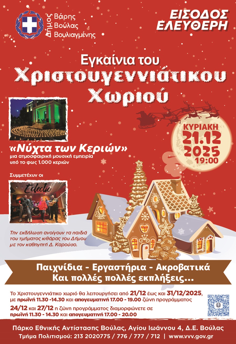 Κυριακή 21 Δεκεμβρίου 2025 – Εγκαίνια του Χριστουγεννιάτικου Χωριού (Πάρκο Εθνικής Αντίστασης Βούλας –  Ώρα: 19:00)