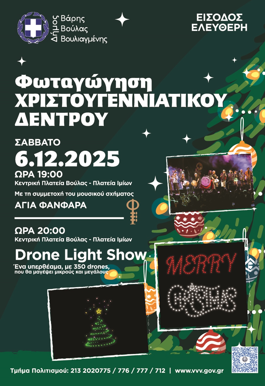 Σάββατο 6 Δεκεμβρίου 2025  – Φωταγώγηση Χριστουγεννιάτικου Δέντρου – Drone Light Show (Κεντρική Πλατεία Βούλας – Πλατεία Ιμίων / Ώρα: 19:00)