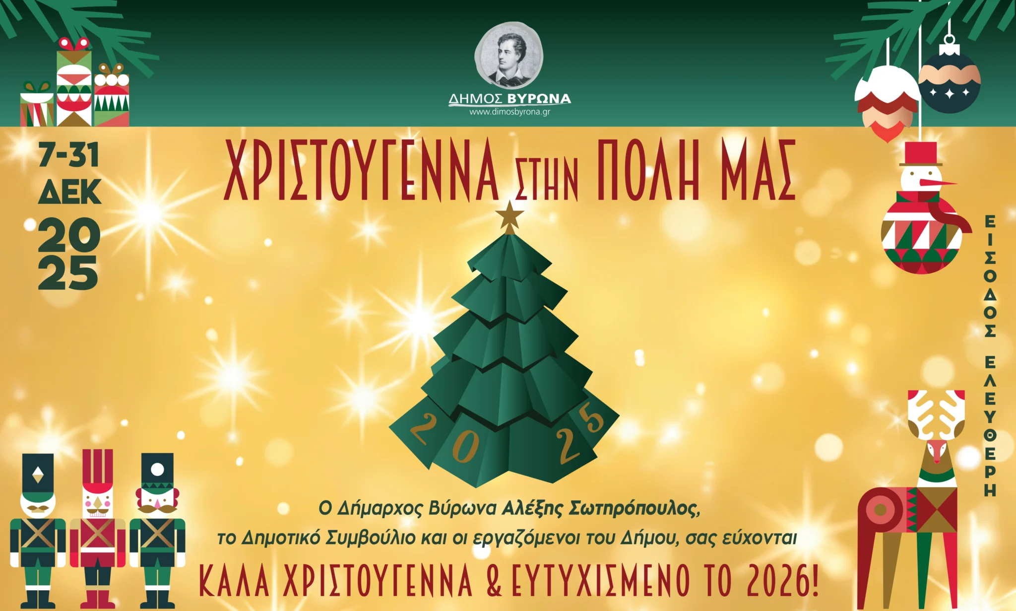 Ο Δήμος Βύρωνα υποδέχεται τα Χριστούγεννα καλώντας μικρούς και μεγάλους στις προγραμματισμένες εορταστικές εκδηλώσεις που θα διαρκέσουν έως το τέλος του μήνα.
